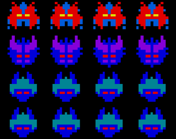 Retro fans can tell quite a similarity to NAMCO's Galaxian from 1979, but it's not an exact replica at all. I was always annoyed with the enemies' erractic sine-wave movements and never good at dodging. So I made the enemies more predictable when they rush at you like kamikaze pilots.